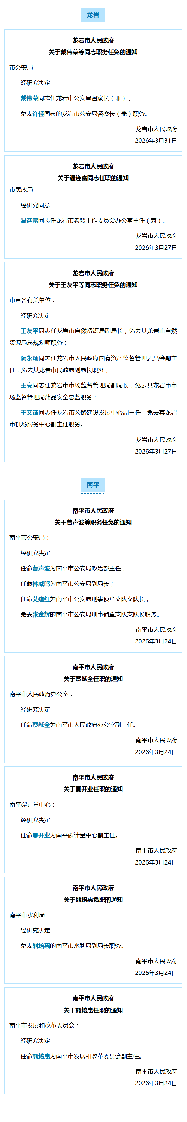 龍巖、南平發(fā)布一批人事任免