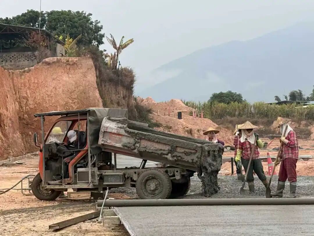 施工現(xiàn)場,挖掘機轟鳴著擴寬修整道路,混凝土運輸車往來穿梭卸料,工人們或手持振搗棒夯實路面,或蹲身搭建模板、校準(zhǔn)路沿石,大家分工明確、配合默契,各項施工環(huán)節(jié)緊鑼密鼓、有序推進,現(xiàn)場一派熱火朝天的繁忙景象。