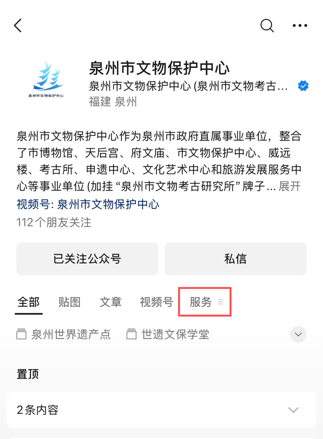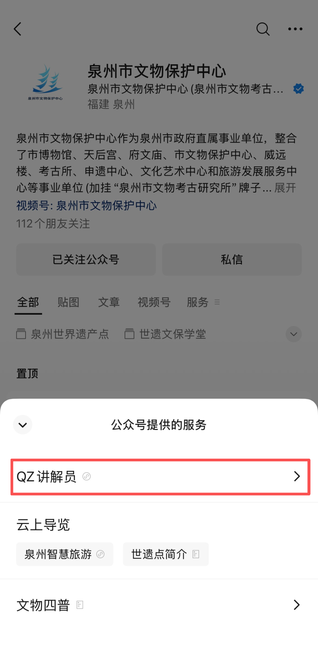 1.通過掃描二維碼或微信搜索,關(guān)注泉州市文物保護(hù)中心公眾號(hào),在【服務(wù)】欄選擇“QZ講解員”進(jìn)入“世遺泉州文化遺產(chǎn)場(chǎng)館講解預(yù)約服務(wù)平臺(tái)”。
